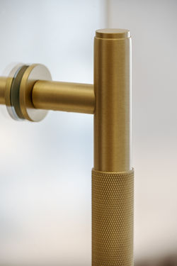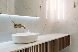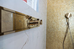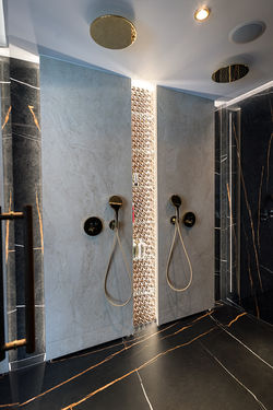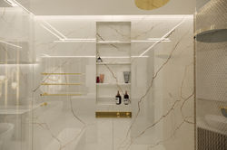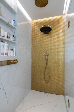 The bathroom is a serene escape, with white marble walls and gold accents. We installed double sinks, a freestanding tub, and a glass shower with a gold mosaic wall for a pop of texture. The tub filler and the master bathroom seat have custom-made stainless steel structures inside, carefully tiled over for a seamless look.