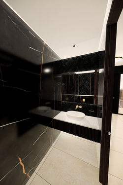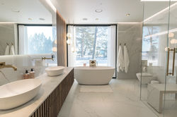 The living area is a standout, with a huge glass ceiling and floor-to-ceiling windows that let in tons of natural light and show off the snowy landscape outside. We added comfy beige sofas and a coffee table made of White Onyx tile to keep things simple and relaxed. The TV wall, also in White Onyx tile, features soft backlighting, adding a touch of modern flair and making the space feel warm and welcoming.