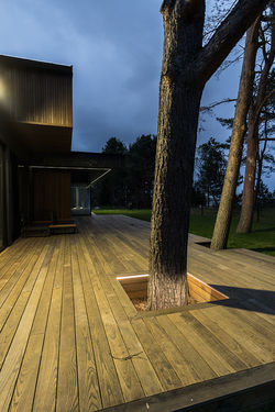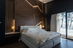 Other spaces, like the bedroom and sauna, follow the same vibe. The bedroom has a geometric wooden headboard wall with built-in lighting, creating a cozy nook. The sauna, with its black tiles and custom-designed benches that widen toward the corner, feels like a little retreat within the retreat. The sauna roof is uniquely made from cones, adding a natural touch. Even the hallway and closet areas feature wooden slats and matt black cabinetry with an anti-fingerprint surface, keeping the look consistent.