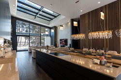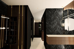 The kitchen and dining area flow together seamlessly, with a wooden slatted wall that matches the flooring. We went with matt black cabinets with an anti-fingerprint surface and a sleek black kitchen island topped with a live-edge wooden counter, paired with modern bar stools. The dining area features a 5m custom-made river table, perfect for gatherings. A sparkling chandelier hangs above, adding a bit of dazzle without going overboard.